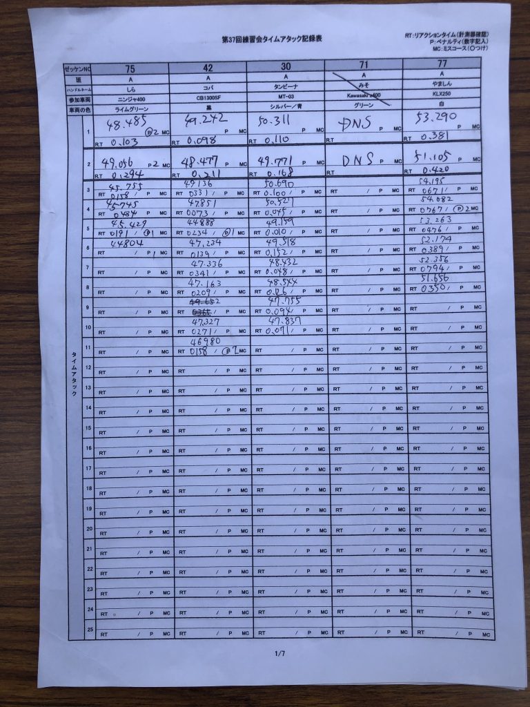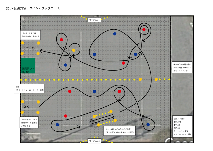 | コース | 舗装路面にパイロンで設定した複数のコースを走行する計測練習会 ・8の字 ・コーススラローム ・タイムアタックコース(計測あり) |