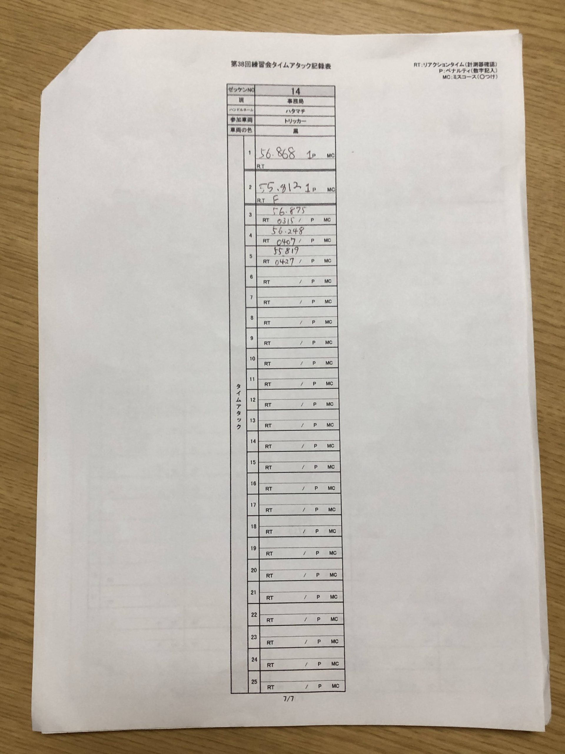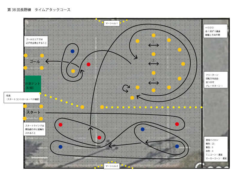 | コース | 舗装路面にパイロンで設定した複数のコースを走行する計測練習会 ・8の字 ・コーススラローム ・タイムアタックコース(計測あり) |