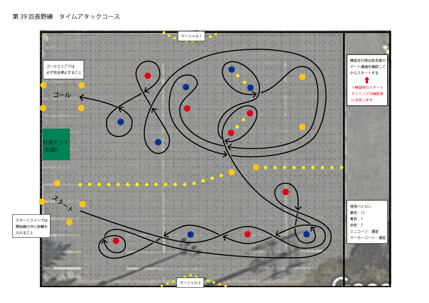 | コース | 舗装路面にパイロンで設定した複数のコースを走行する計測練習会 ・8の字 ・コーススラローム ・タイムアタックコース(計測あり) |