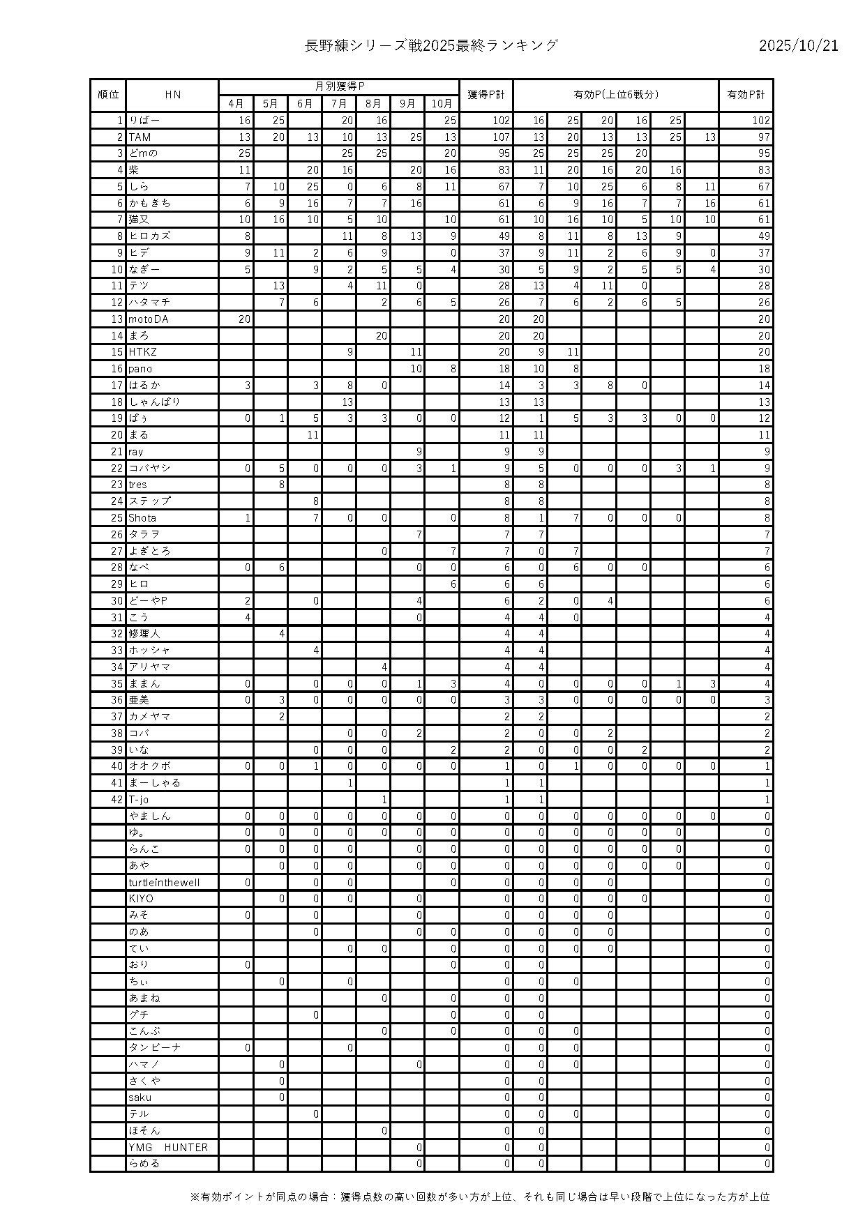 2025年長野練シリーズ戦ランキング
